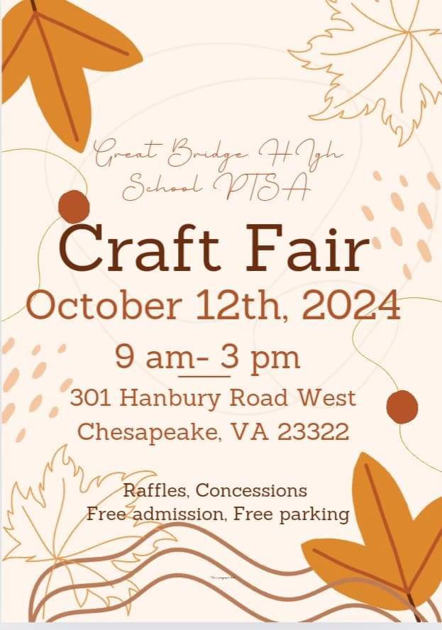 Join us at the Great Bridge High School Craft Fair on Saturday, October 11, 2025 from 9:00 a.m. to 3:00 p.m.