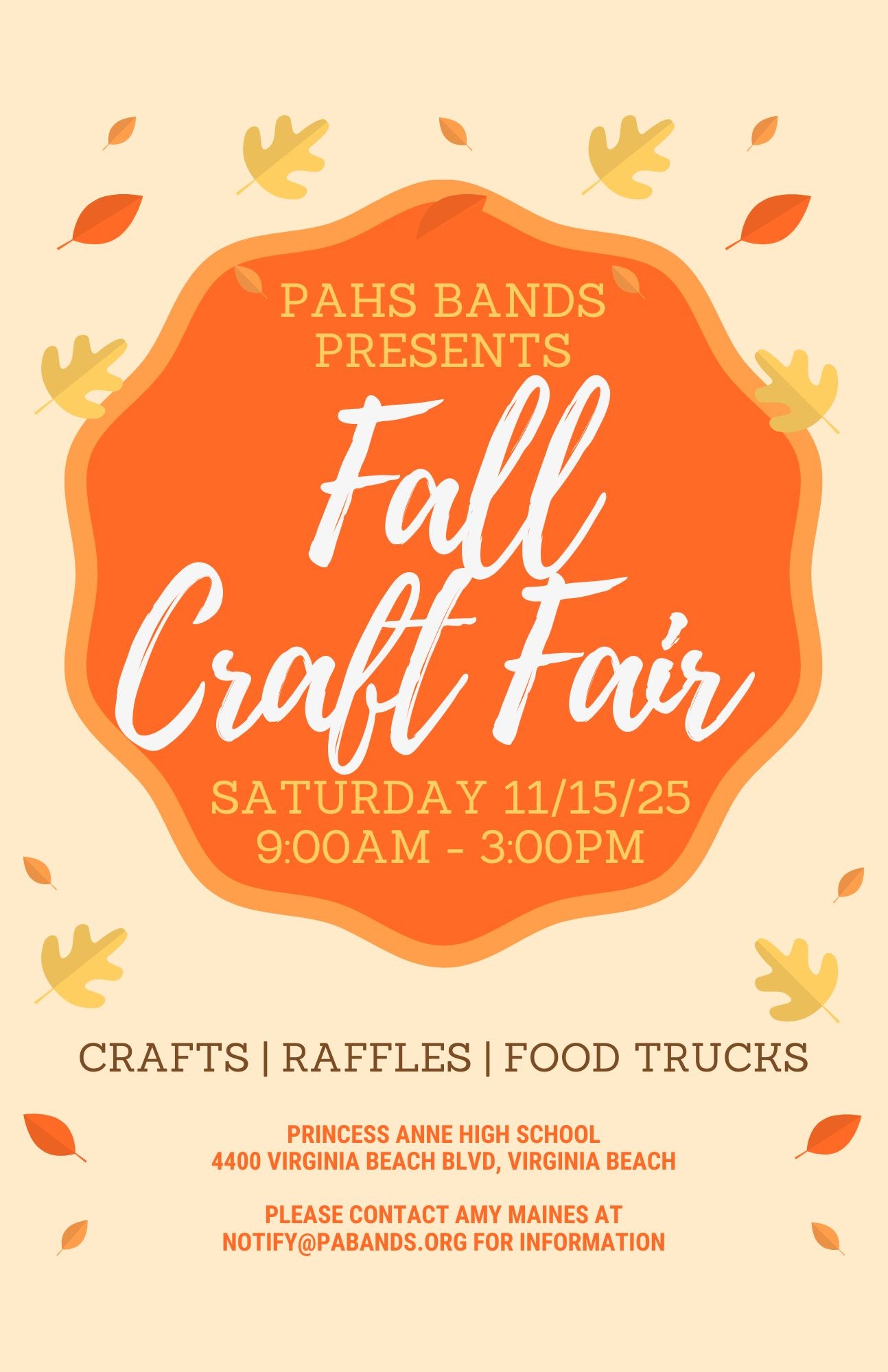 Join us at the Princess Anne High School Bands Fall Craft Fair on Saturday, November 15, 2024, from 9:00 a.m. to 3:00 p.m.